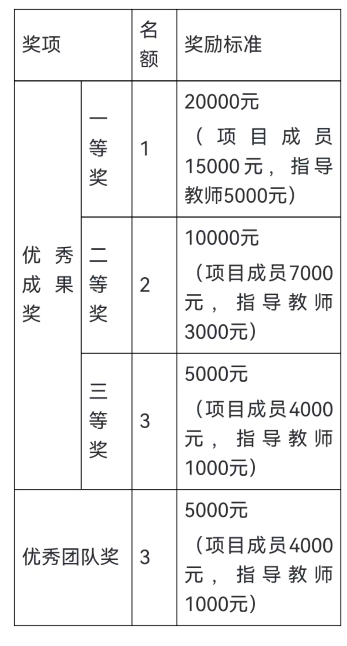 本次评奖环节设置优秀成果奖、优秀团队奖及优秀指导教师奖三类奖项。其中,优秀成果奖和优秀团队奖仅可选择一项申报,不得同时申报。获得优秀成果奖和优秀团队奖的项目指导教师获评优秀指导教师。奖励标准如下表所示: