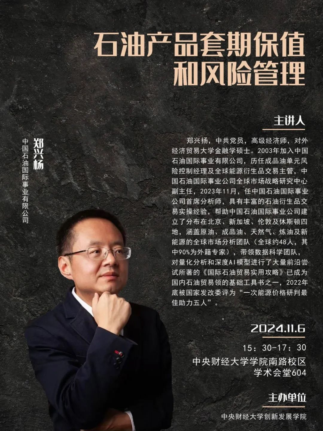 郑兴扬,中共党员,高级经济师,对外经济贸易大学金融学硕士。2003年加入中国石油国际事业有限公司,历任成品油单元风险控制经理及全球能源衍生品交易主管,中国石油国际事业公司全球市场战略研究中心副主任,2023年11月,任中国石油国际事业公司首席分析师,具有丰富的石油衍生品交易实操经验,帮助中国石油国际事业公司建立了分布在北京、新加坡、伦敦及休斯顿四地,涵盖原油、成品油、天然气、炼油及新能源的全球市场分析团队(全球约48人,90%为外籍专家),带领数据科学团队,对量化分析和深度AI模型进行了大量前沿尝试,所著的《国际石油贸易实用攻略》已成为国内石油贸易领域的基础工具书之一,2022年底被国家发改委评为“一次能源价格研判最佳助力五人”。