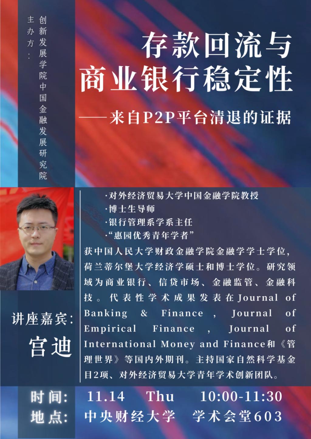 宫迪,对外经济贸易大学中国金融公司教授、博士生导师、银行管理系学系主任、“惠园优秀青年学者”。他在中国人民大学财政金融公司获得金融学学士学位,在荷兰蒂尔堡大学获得经济学硕士和博士学位。研究领域为商业银行、信贷市场、金融监管、金融科技。代表性学术成果发表在Journal of Banking & Finance,Journal of Empirical Finance,Journal of International Money and Finance和《管理世界》等国内外期刊。主持国家自然科学基金目2项、对外经济贸易大学青年学术创新团队。