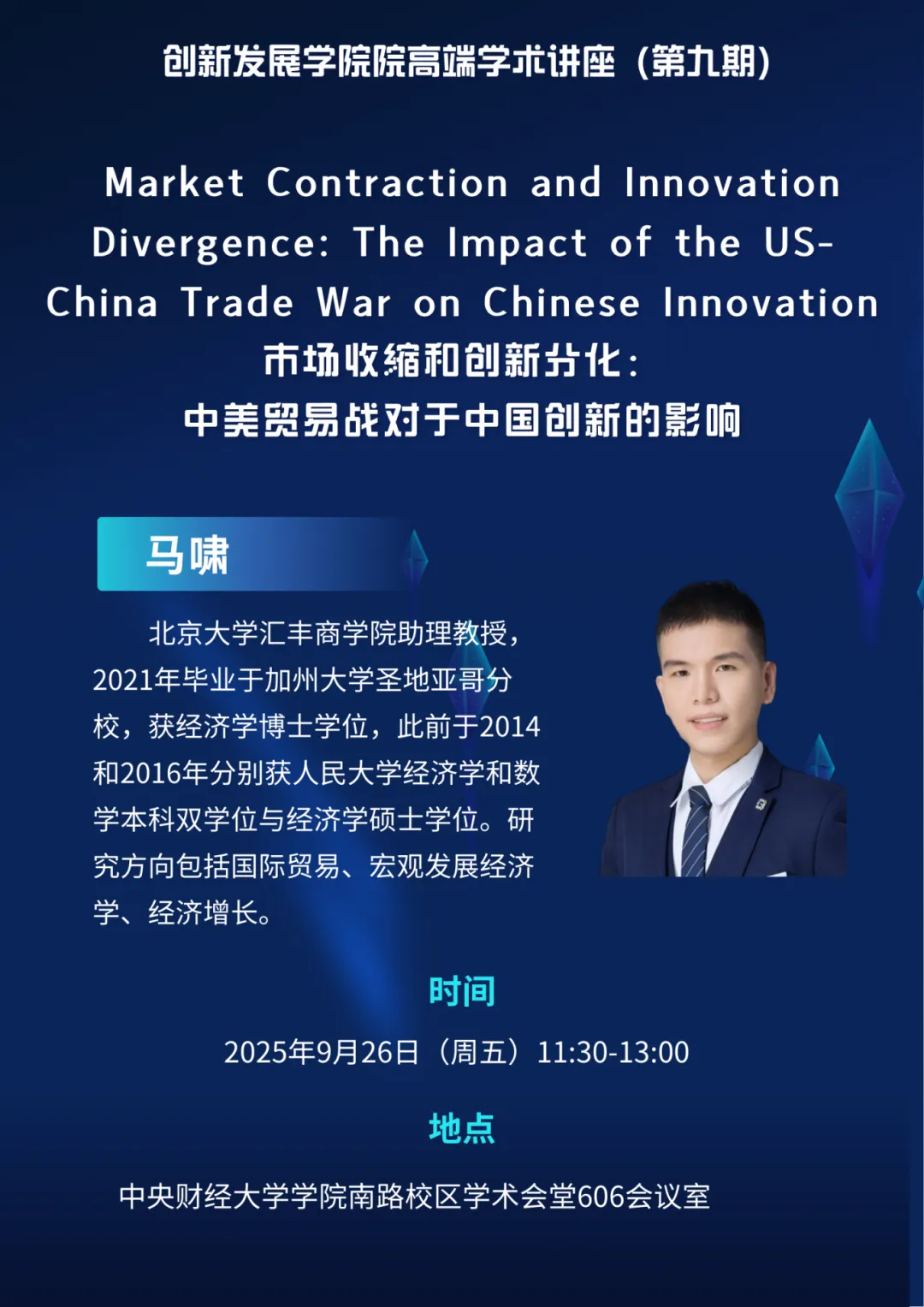 太阳成集团tyc9728高端学术讲座(第九期),理悦CEMA•知与行系列研讨会2025年第1讲将于9月26日(周五)11:30-13:00在学术会堂606会议室举行,由北京大学汇丰商公司的马啸老师报告“市场收缩和创新分化:中美贸易战对于中国创新的影响”,欢迎感兴趣的师生(尤其是对科研有兴趣的本科生、硕士生和博士生)参加。