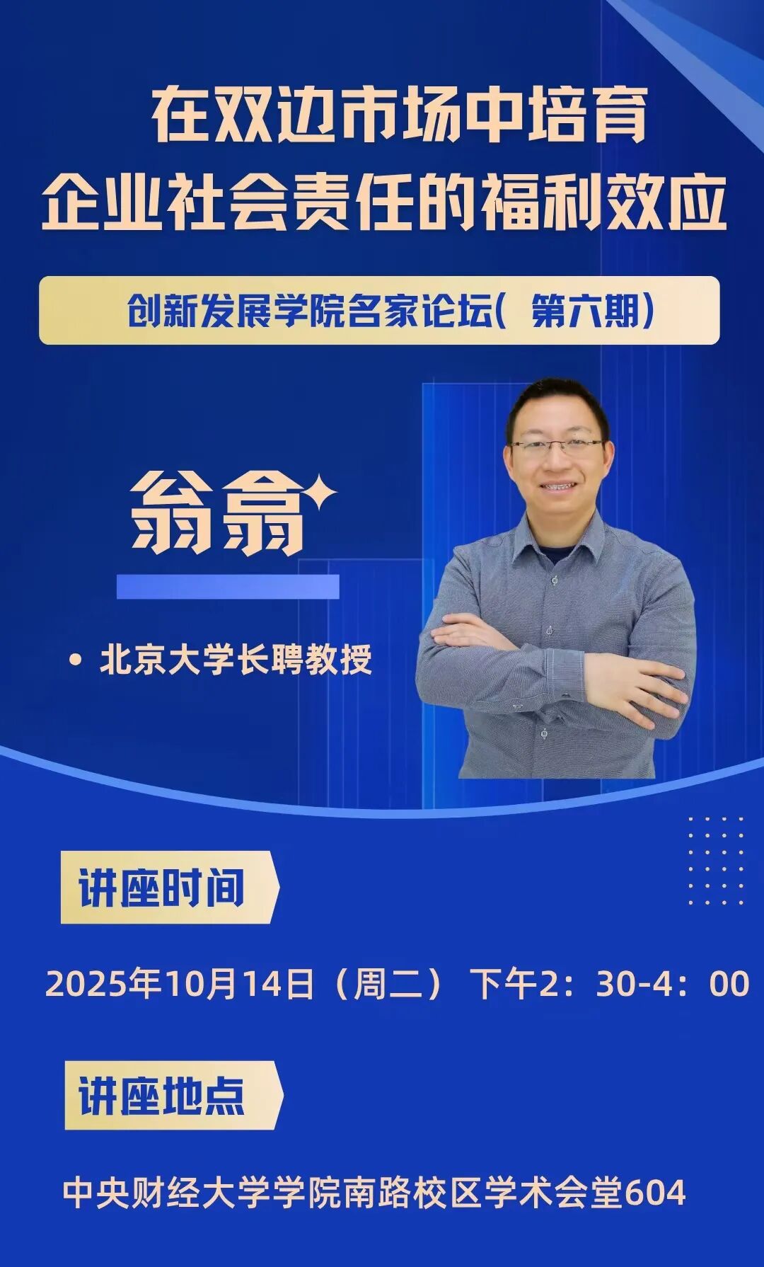 太阳成集团tyc9728名家论坛(第六期)将于10月14日(周二)14:30-16:00在学术会堂604会议室举行,由北京大学光华管理公司应用经济系的翁翕老师报告“在双边市场中培育企业社会责任的福利效应”,欢迎感兴趣的师生(尤其是对科研有兴趣的本科生、硕士生和博士生)参加。