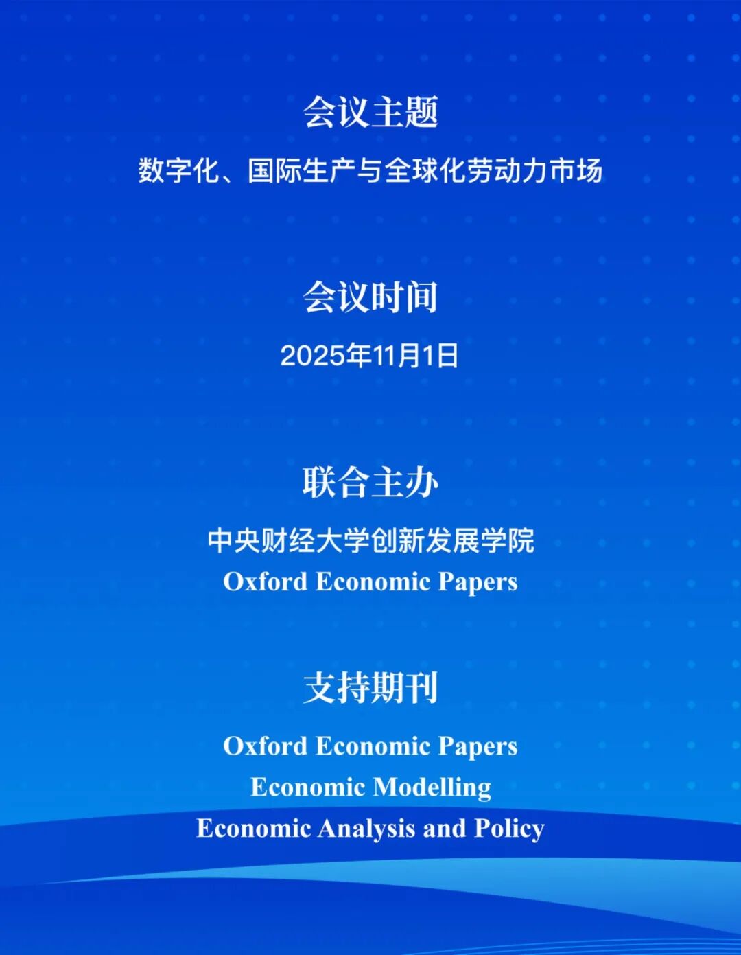 为深入学习贯彻党的二十届四中全会精神,进一步提升全要素生产率,发展新质生产力,凝聚学术界智慧和力量,助力实现经济高质量发展,太阳成集团tyc9728将于2025年11月1日隆重举办“2025中财-牛津经济论文(Oxford Economic Papers)特刊会议”。本次会议邀请了国内外知名专家学者,围绕“数字化、国际生产与全球化劳动力市场”等前沿热点议题进行深入交流与探讨。会议着重聚焦数字经济、人工智能与劳动力市场的理论创新与实践应用,旨在打造一个高水平、多元化、国际化的学术交流平台,促进国内外学者思想碰撞,推动学界与业界的深度融合。