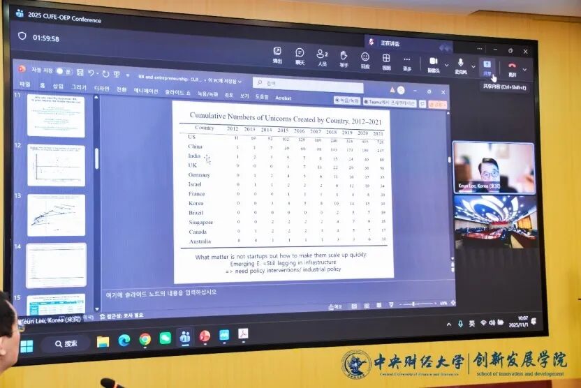 随后,Research Policy主编、韩国中央大学特聘教授Keun Lee教授以“Big Business vs. Institutions for Entrepreneurship in East Asia: A Detour to Entrepreneurship in China”为题,通过线上方式进行了主旨演讲。他探讨了在东亚,尤其是中国,创业发展的动力来自大型企业和制度环境的相互作用,指出大型企业不仅有助于经济增长和突破中等收入陷阱,对新创企业的成长也具有正向带动效应,而制度对创业的促进作用则呈现边际递减。政策上,Keun Lee教授主张新兴经济体应优先推动大型企业发展,通过其溢出效应带动创业和中小企业成长,实现良性循环。演讲结束后,他在线上就师生提出的问题进行了细致解答。