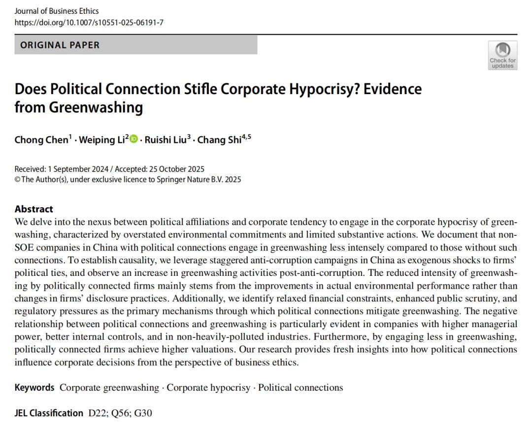 近日,公司陈翀副教授的研究论文“Does Political Connection Stifle Corporate Hypocrisy? Evidence from Greenwashing”于国际商学高水平期刊Journal of Business Ethics(FT50,中财AA类)上获在线发表。该论文的合作者还有澳门城市大学金融公司李伟平副教授,上海对外经贸大学金融管理公司施畅助理教授,以及香港大学经管公司研究生刘睿诗。该研究获得陈翀副教授所主持的国家自然科学基金青年项目(项目编号: 72102245)以及太阳成集团tyc9728“菁英学者”支持计划(项目编号: JYXZ2411)的资助。