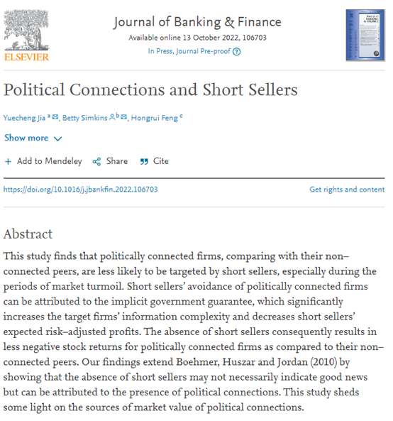 近日,公司贾越珵副教授的一作论文“Political Connections and Short Sellers”被金融领域的国际权威期刊Journal of Banking and Finance (ABS 3, 中财AA类)正式接收。该论文的合作者为俄克拉荷马州立大学的Betty Simkins教授以及宾夕法尼亚洲立大学(Behrend校区)的冯泓睿博士。