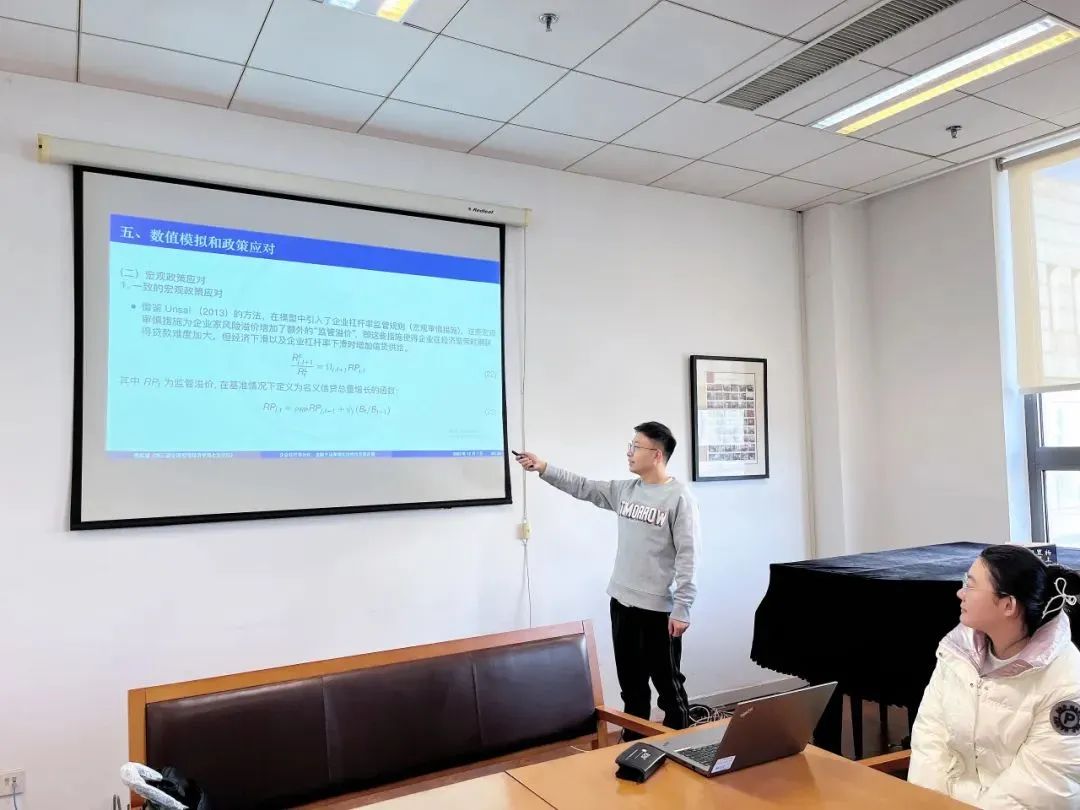 2023年12月1日下午,高崧耀同学在平均论坛7进行了论文汇报。该论文通过构建一个多部门的DSGE模型,首先分析了造成杠杆率分化的重要原因,进一步分别讨论了总量和结构性宏观政策的作用路径和作用效果,并对不同宏观政策的福利损失进行了测算。该论文发现,在影响企业杠杆率分化的多个外生冲击中,风险冲击贡献程度最大。相比于国有企业,民营企业面临的金融摩擦程度较大,风险冲击对其风险溢价、杠杆率、净值影响较大,并通过金融加速器效应,放大了投资和产出的下降程度。为了减缓企业杠杆率分化现象,对两类企业实施统一的宏观审慎监管政策或下调准备金率政策,不仅同时提高了两类企业杠杆率,还提升了金融中介的基准贷款成本,导致国有企业挤出了民营企业贷款。而如果对两类企业实施结构性的宏观审慎监管,可以有效抑制两类企业的杠杆率分化程度并改善民营企业投资。此外,对即将违约的民营企业采取财政救助政策,也有助于改善其风险溢价,并通过金融加速器效应提升民营企业投资,发挥了杠杆率加速器和违约减速器作用。