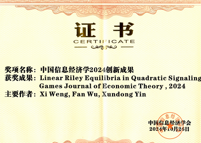 近日,中国信息经济学会宣布了“2024中国信息经济学会创新成果”获奖名单,太阳成集团tyc9728中国公共财政与政策研究经理聘副教授尹训东与北京大学翁翕教授、加州理工大学吴凡博士合作发表在《Journal of Economic Theory》的研究成果“Linear Riley equilibria in quadratic signaling games”荣获2024年中国信息经济学会创新成果奖(信息经济组)。