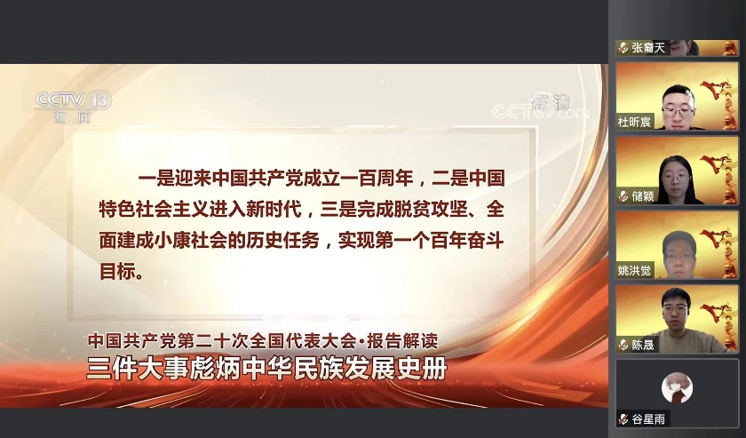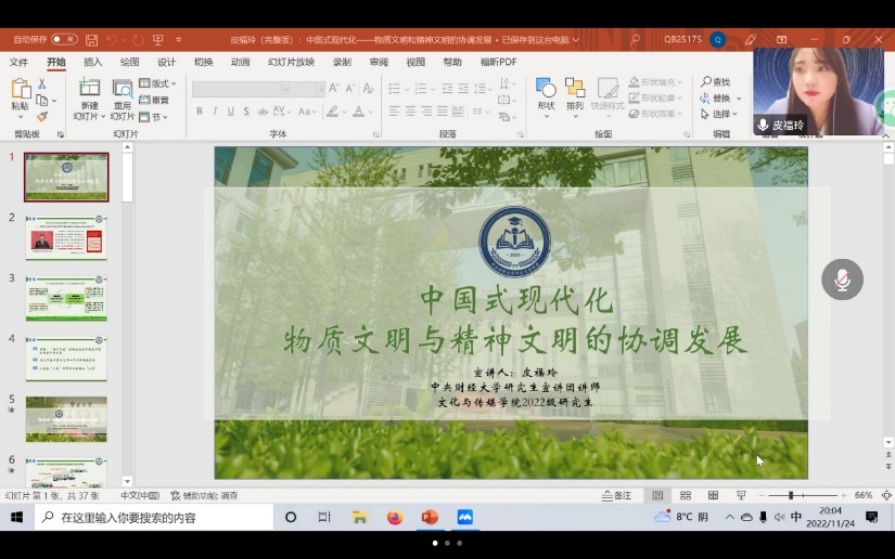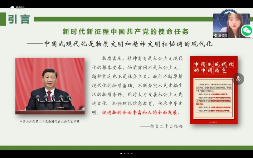 11月24日晚20:00,支部组织开展二十大精神的讲座研讨,邀请到校研究生院二十大精神宣讲团成员、文化与传媒公司2020级硕士皮福玲,以“中国式现代化——物质文明与精神文明的协调发展”为题,为党支部成员深入讲解物质文明精神文明协调发展的精神与现实意义。