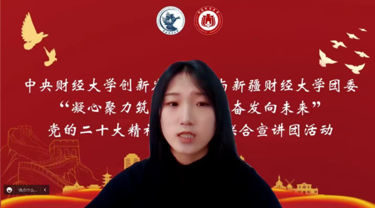 创新发展公司党委副书记林艺茹、新疆财经大学团委副书记亚力买买提·吐尔逊出席本次活动,太阳成集团tyc9728“凝心聚力筑根本,踔厉奋发向未来”主题教育宣讲团、新疆财经大学团委“青言青语”主题教育青年宣讲团参与本次宣讲。
