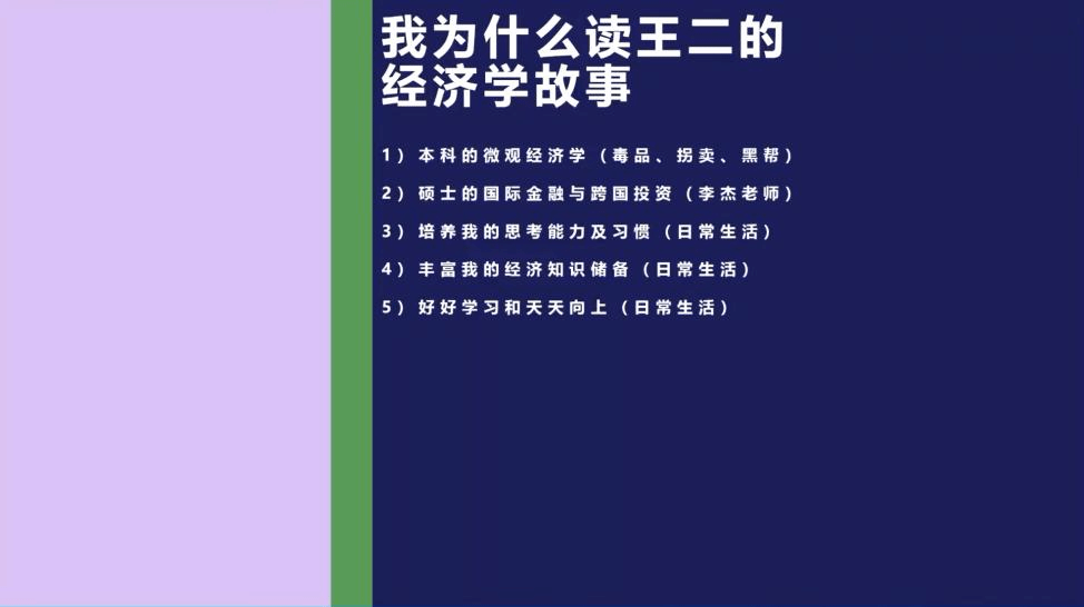 孙恺同学向我们介绍了选择《王二的经济学故事》这本书的原因。在学习经济学的课程中,我们接触到很多偏学术和理论的内容,很少运用经济学的原理去解释生活中的经济学现象。而《王二的经济学故事》通过一个个生动的小故事,把蕴含在日常生活中的经济学逻辑以幽默轻松的方式讲述出来,帮助我们以辩证的经济学思维去探究生活的本质。