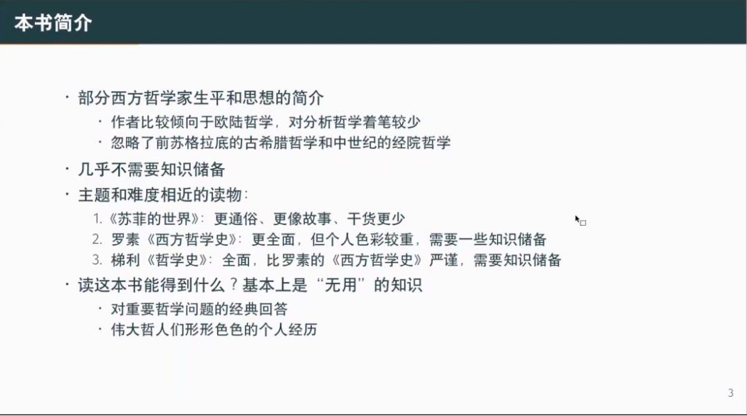 明洋老师先以如何选书,什么书是好书为引子,带我们走进书籍的世界。他介绍《哲学的故事》是一本非常合适的哲学入门书,主题相近的还有《苏菲的世界》《哲学史》《西方哲学史》 。这些书虽然带给我们的几乎都是对于生存“无用”的知识,但可以给予我们生活的智慧和启迪。