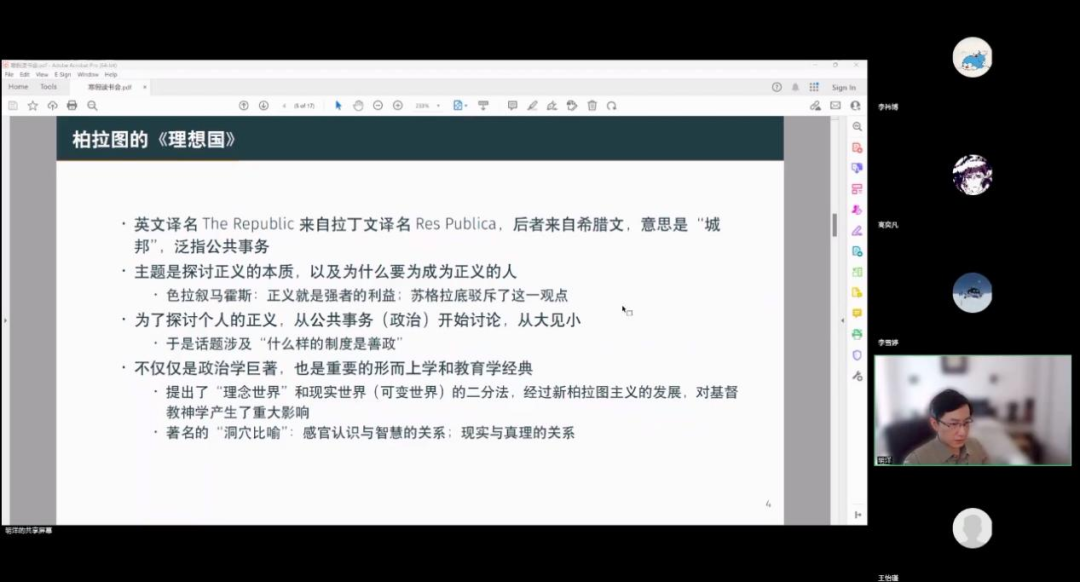 明洋老师讲解了柏拉图《理想国》和培根《新工具》中的思想,介绍了柏拉图的“洞穴比喻”和他的政治、道德思想,展示了哲学与现实生活相结合的魅力。老师在对培根的介绍中,着重强调了培根创立了“四偶像”用于批判经院哲学,同时提醒我们要用辩证的眼光看待经院哲学,认识培根的时代局限性。