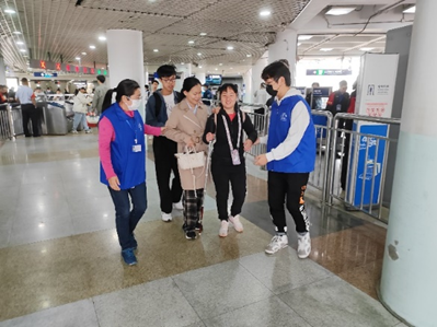 志愿者帮助视力障碍乘客前往无障碍电梯