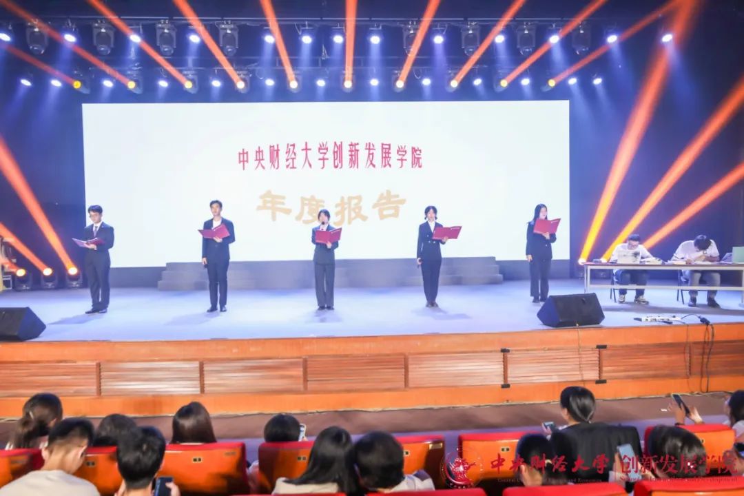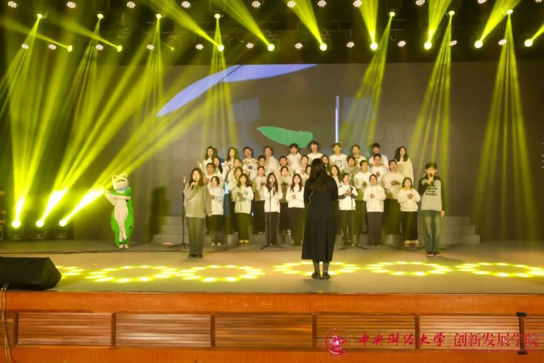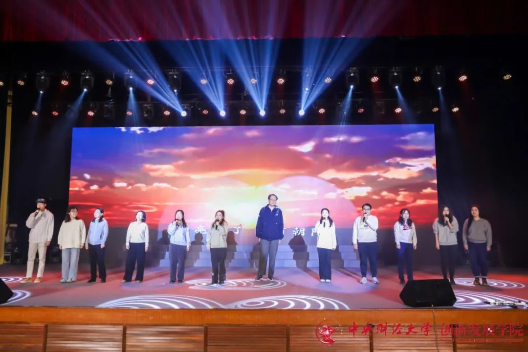 第二篇章在财政学(财政理论与政策)24班全体同学气势磅礴的《黄河大合唱》中展开,铿锵有力的歌声中唱出了青年的热血和激情。相声表演《中财老员工年度报告》,用诙谐有趣的方式讲述学习生活中的趣事与无奈,让大家忍俊不禁的同时又深有所感。经济学(数理经济与数理金融)24-2班同学合唱《平凡之路》,用真挚的歌声诠释对梦想与人生的深刻共鸣。金融学(国际金融与公司理财)24-1班同学带来的合唱《我们都是追梦人》,用热血与活力展现追逐梦想的坚定信念。在创意节目《校园新闻联播》中,覃迪菲、陈琳欣用妙趣横生的校园故事,为观众带来耳目一新的视听感受。