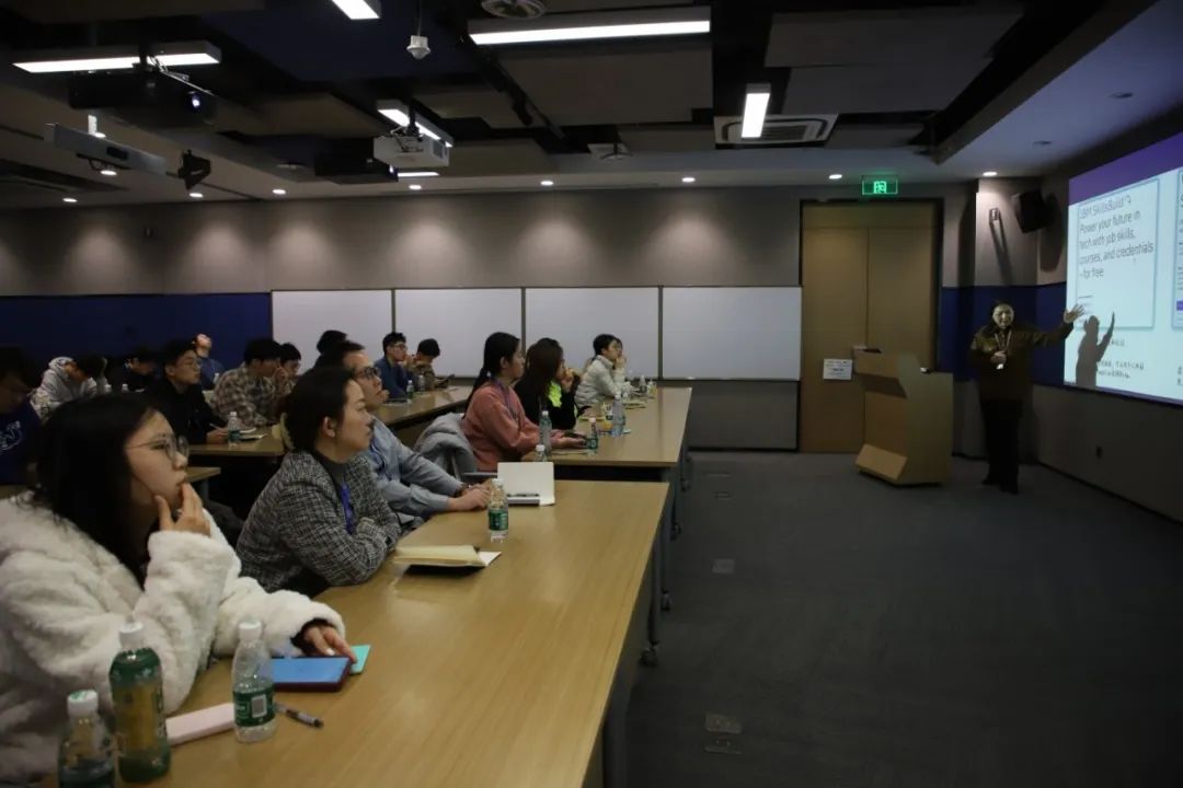 参观结束后,IBM大学合作部工作人员介绍了IBM在科研领域的相关产品IBM Skills Build,表示该项产品立足科技前沿,汇聚技术尖端,通过智慧平台为员工提供学习资源的同时也提供了实习机会。