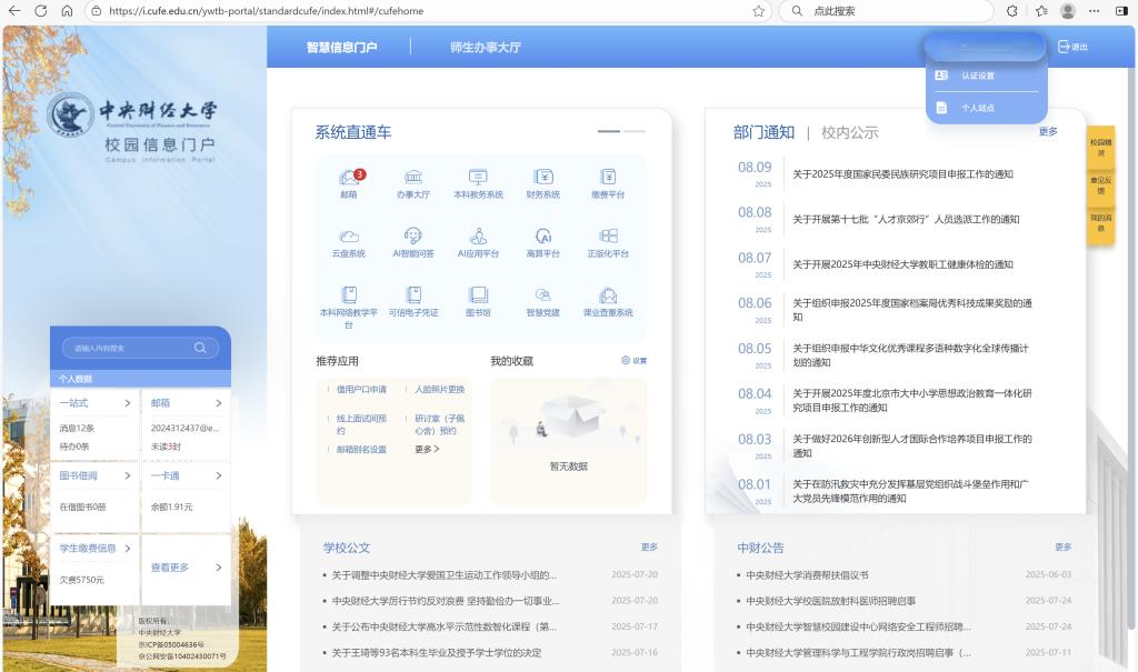 简介:校内综合信息服务平台入口。登录后可查看校园OA公告通知、查询校园卡余额及消费明细、缴纳网费、查询图书借阅信息、了解体测及课外锻炼情况等。登录后七日内免密码认证,方便常用设备访问。
