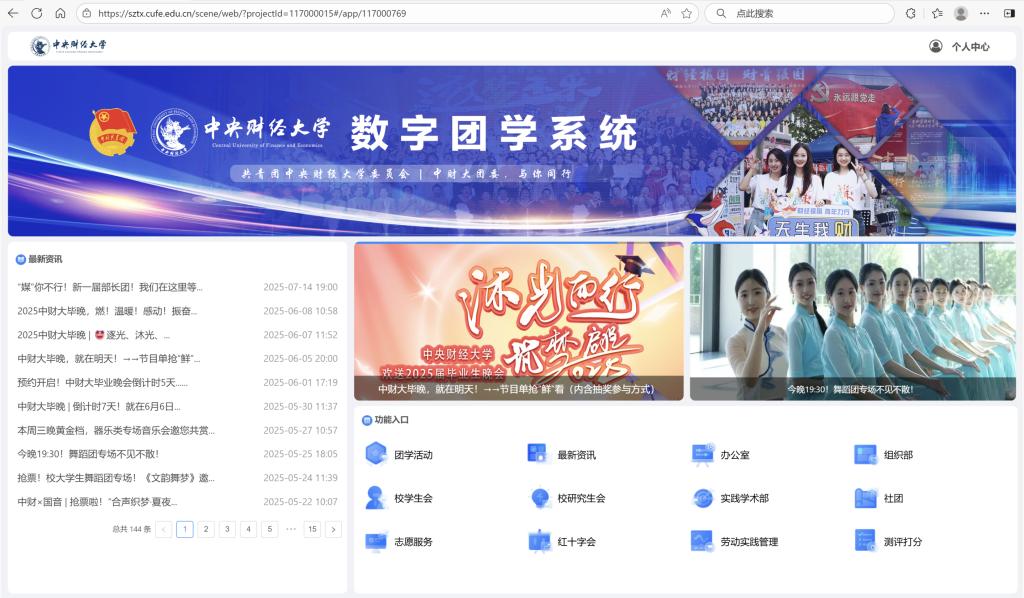 简介:校内团学工作与员工活动的综合线上平台。同学们能在这里获取各类最新团学资讯,便捷参与招新活动、查询志愿服务信息,还能对接校员工会、校研究生会等各类团学组织,助力同学们深度融入校园团学工作,是校园团学事务与青春互动的重要数字化窗口。
