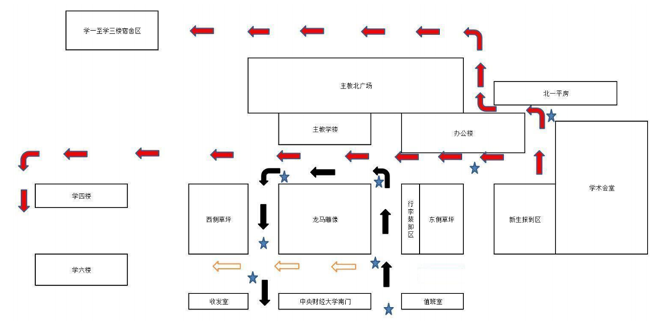 红色箭头表示新生行进路线,避免和机动车辆产生交叉。