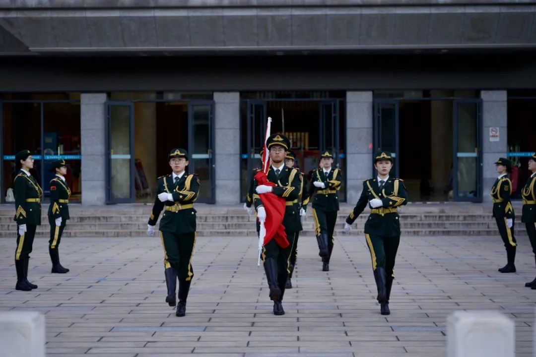 晨光初露,东方既白,国旗护卫队迈着整齐划一、铿锵有力的步伐走向升旗台。鲜艳的五星红旗在风中猎猎作响,似火焰般燃烧,在阳光的映照下徐徐升起,如同一轮红日冲破云霄,将光辉洒向大地,也点燃了在场每一个人心中对祖国的热爱之情。