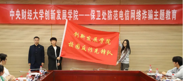 为培养员工的责任感,发挥员工骨干在反诈宣传中的积极作用,扩大反诈知识的覆盖面,公司组建成立“反诈先锋队”。会上,王颖书记为反诈先锋队代表颁发聘书,范维副处长为反诈先锋队授旗。公司反诈先锋队代表、经济学(数理经济与数理金融)22-2班冷昊辰宣读公司反诈公约,呼吁“反诈之路,始于点滴,无诈校园,从我做起”。