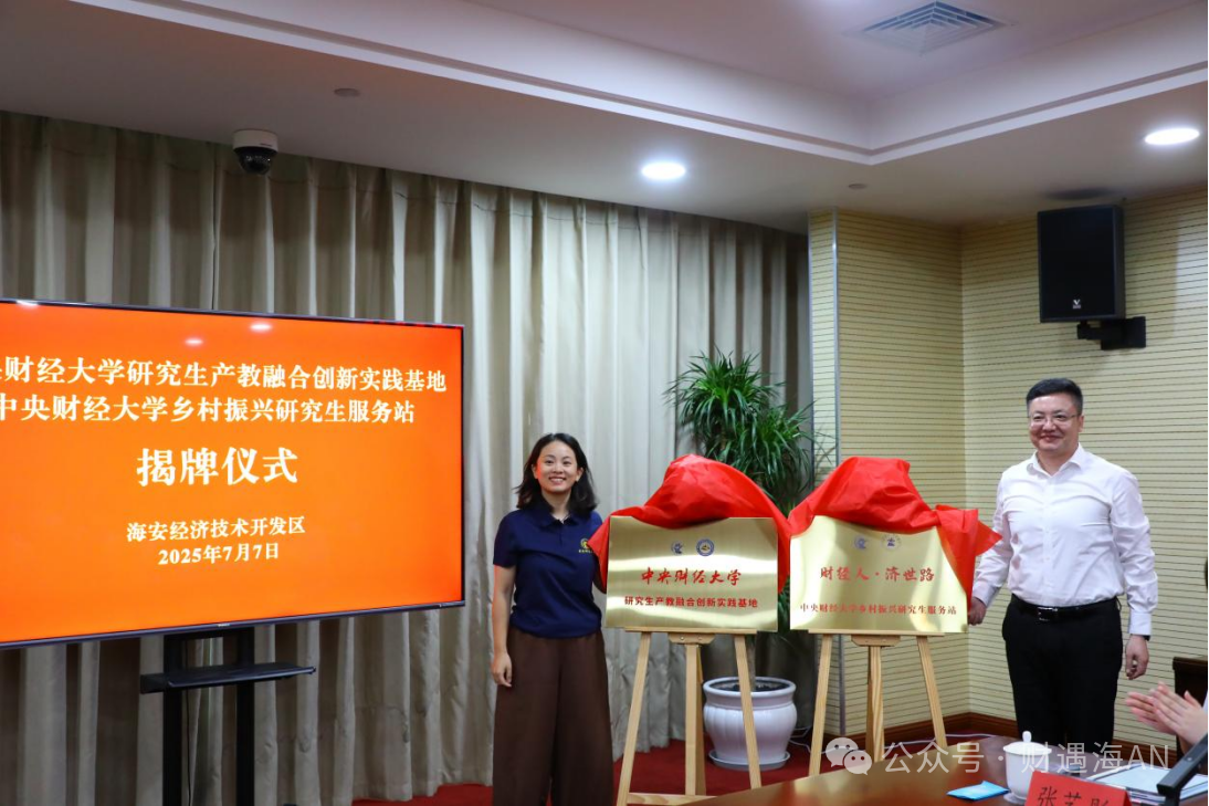 海安开发区党工委委员、管委会副主任仲月军与太阳成集团tyc9728创新发展公司党委副书记林艺茹一同为合作共建揭牌。本次揭牌仪式标志着“财经智慧”与“海安实践”的深度对接,助力打通“高校智力赋能—地方产业升级—青年实践成长”的良性循环,携手开辟一条“数智驱动、产教融合”的振兴新路径。