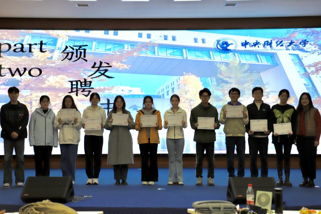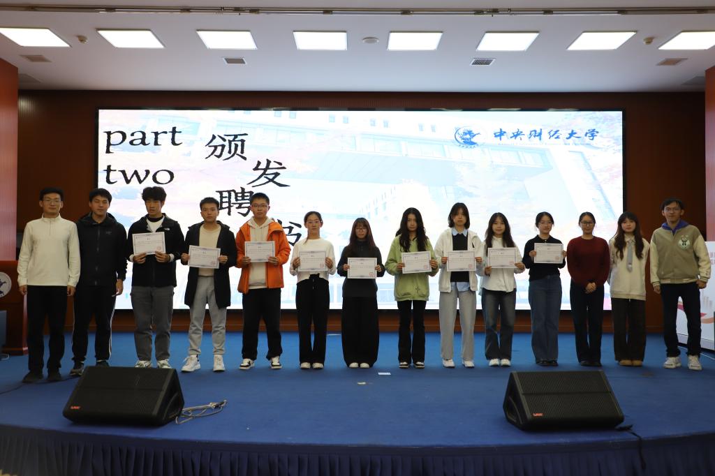 巴蕾老师、柴新凯老师、沈嘉怡老师为团委员工副书记、员工会主席团和新闻中心主任、副主任颁发聘书;随后,员工会主席团、团委员工副书记和新闻中心副主任为各部门负责人颁发聘书。最后,各部门负责人为所在部门干事颁发聘书。