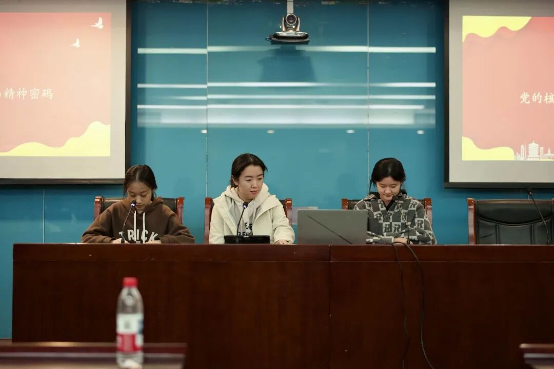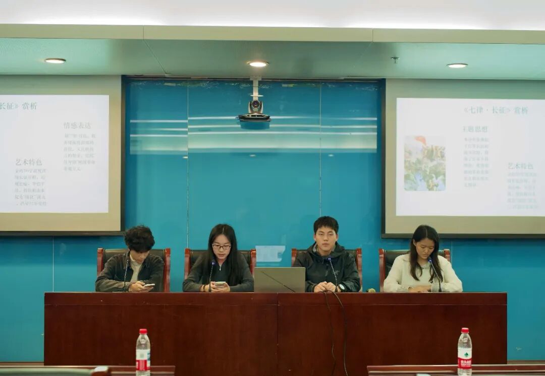 孙宁萱小组分享了李君如的《时代大潮与中国共产党》,她们讲述了中国共产党在时代大潮中的历史抉择以及党的核心能力和精神密码;杨淞宇小组分享了美国记者埃德加·斯诺的《红星照耀中国》,他们讲述了斯诺如何通过记述的所见所闻改变自己和世界对中国共产党的偏见;殷梓盛小组选取了《毛主席诗词选》中的四首经典诗词并对诗词的内容和背景进行了解说;廖荣迁小组分享了《学习习近平总书记重要讲话》,强调应铭记历史,砥砺前行;赵晨曦、郄奕菲两位同学则带来《青春之歌》的分享,展现了在特定时代背景下青年在时代浪潮中觉醒成长并投身革命的壮阔历程。