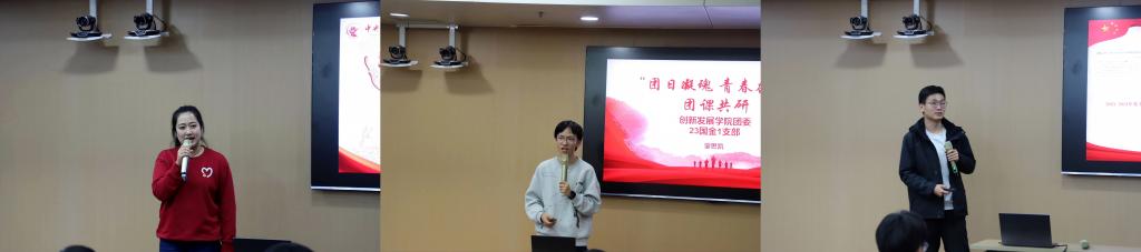 数理25-1团支部书记娄潇丹介绍了“踏访圆明故地遗址,铭记历史砥砺初心”主题团日活动概况。通过参观大水法、资料搜集与小组讨论,既凝聚团心,更使同学们在铭记历史中坚定红心向党的信念。国金24-2团支部书记隗立彤以“金融青春担使命 以学践悟赴新约”为题,从“专业+历史”融合形成研学报告,结合金融专业特色设计“历史史料+专业视角”的研学任务,并制作微视频、团支部公众号系列推送展现成果。国金24-1团支部书记王麒皓介绍“寻香山峥嵘岁月,写青春壮丽征程”团日活动,从“细分工,多模式,广宣传”多个角度开展,联合红色基地与海淀融媒构筑立体宣传阵地,传播青年声音,积极打造支部品牌特色。