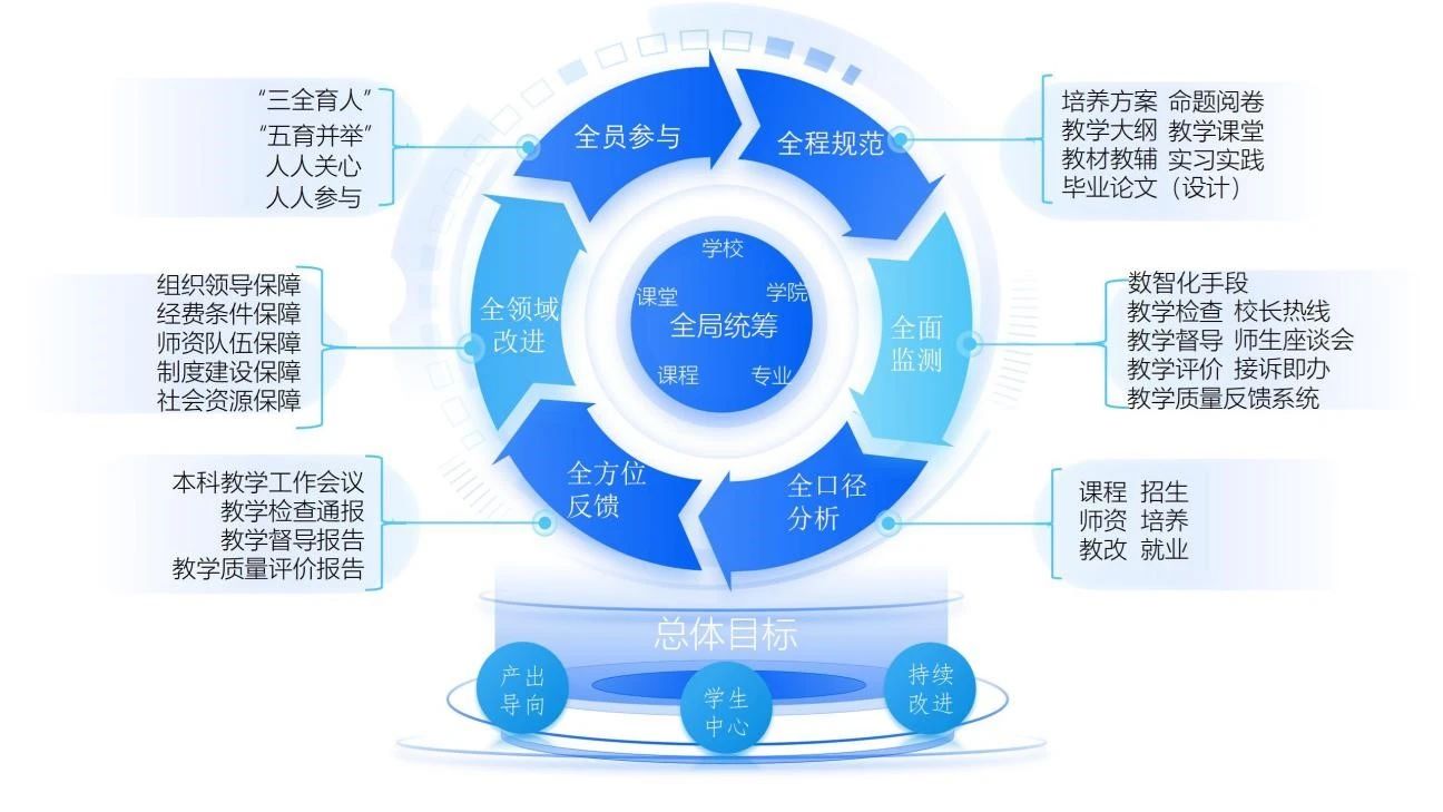 集团按照“守正创新,卓越发展”的质保理念,全面落实“员工中心、产出导向、持续改进”的具体要求,构建了全局统筹、全员参与、全程规范、全面监测、全口径分析、全方位反馈、全领域改进的本科教学质量保障体系。