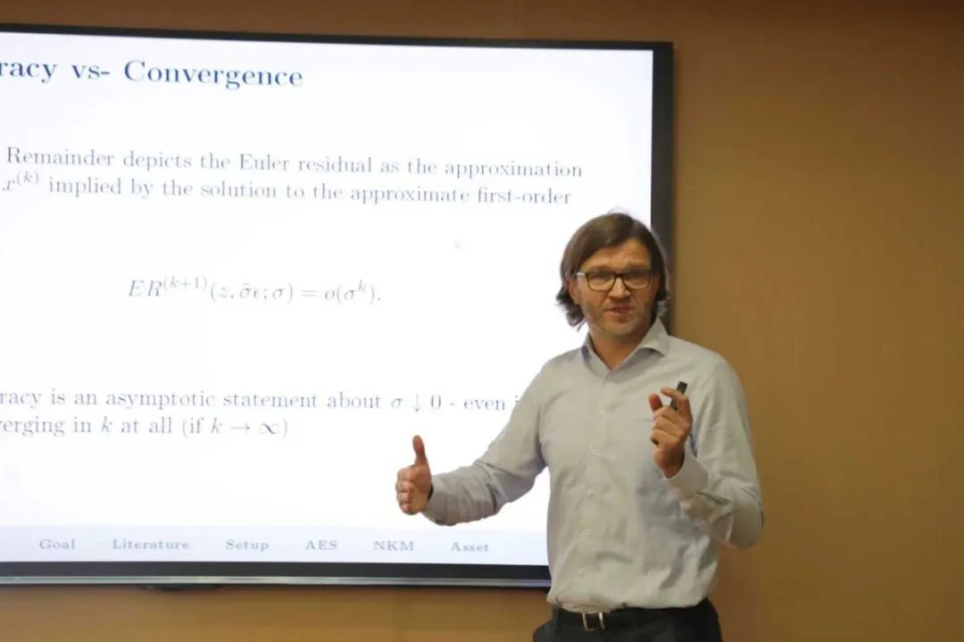 在报告中,Evers教授系统阐述了一种简化非线性预期模型分析的新方法框架。他提出,可以通过将不确定性归纳为少数关键度量(例如冲击的矩)来实现分析的透明化与可操作化,并展示了该方法在利率、通胀及资产价格等宏观和金融变量研究中的应用价值。该框架不仅保持了与主流工具的兼容性,还强调直观性与可解释性,为研究者处理复杂不确定性问题提供了新的思路。Evers教授特别结合货币政策与资产定价的案例,展示了该方法如何有效区分状态变量的非线性特征与风险认知,从而帮助学界和政策界更清晰地理解冲击与政策反应的关系。