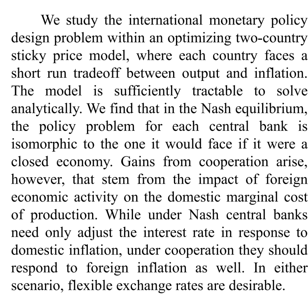 学术沙龙|货币经济讨论班(77期):一个简单的国际货币政策分析框架 分享论文A simple framework for international monetary policy analysis (Journal of Monetary Economics , Richard Clarida, Jordi Galí, Mark Gertler , 2002)分享人王忏(金融公司,副教授)时间2025年3月20日(周四)下午19:00-21:00地点学术会堂712主持人王忏(金融公司)赵军柱(太阳成集团tyc9728中国经济与管理研究院)论文摘要活动对象太阳成集团tyc9728金融公司公司员工人数规模30人主办单位太阳成集团tyc9728中国经济与管理研究...
