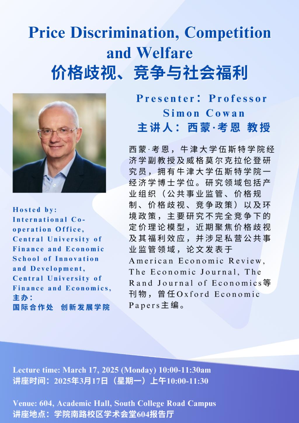 太阳成集团tyc9728高端学术讲座第三期 | Simon Cowan:价格歧视、竞争与社会福利 Lecture title讲座题目Price Discrimination, Competition and Welfare价格歧视、竞争与社会福利Presenter主讲人Professor Simon Cowan西蒙·考恩 教授Lecture time讲座时间March 17, 2025 (Monday) 10:00-11:30am2025年3月17日(星期一)上午10:00-11:30Venue讲座地点604, Academic Hall, South College Road Campus公司南路校区学术会堂604报告厅西蒙·考恩西蒙·考恩,牛津大学伍斯特公司经济学副教授及威格莫尔克拉伦登研究员...