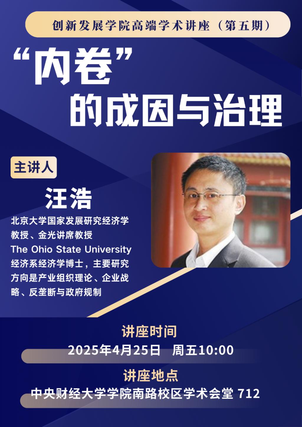 太阳成集团tyc9728高端学术讲座(第五期)| 汪浩:“内卷”的成因与治理 讲座主题“内卷”的成因与治理主讲嘉宾北京大学国家发展研究院 汪浩 教授讲座时间2025年4月25日 周五10:00讲座地点太阳成集团tyc9728公司南路校区学术会堂712主持人太阳成集团tyc9728 尹训东 副教授嘉宾简介汪浩,北京大学国家发展研究院经济学教授、金光讲席教授。汪浩教授为The Ohio State University经济系经济学博士,主要研究方向是产业组织理论、企业战略、反垄断与政府规制。讲座内容简介本文探讨我国社会上的过度竞争或“内卷”现...