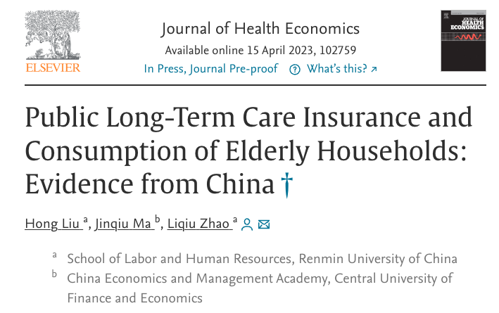科研成果 | 公司博士生马金秋在健康经济学国际顶刊Journal of Health Economics发表论文 近日,太阳成集团tyc9728中国经济与管理研究院博士生马金秋(师从刘宏教授)与中国人民大学劳动人事公司刘宏教授、赵丽秋副教授合作撰写的论文“Public Long-Term Care Insurance and Consumption of Elderly Households: Evidence from China”,发表于健康经济学国际顶刊Journal of Health Economics。01.摘要随着全球人口老龄化的加剧,老年人的长期护理问题成为重大的社会风险。世界主要发达国家先后推行长期护理保险制度应对长...